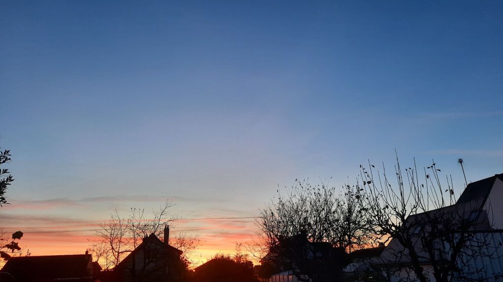 Ce matin, elle a vu le soleil se lever. Elle a levé le guidon de son nez. Gel au sol et feu dans le ciel orange rouge rose et bleu. Tant de couleurs lumineuses contrastant avec les ombres des arbres et des maisons. Jour, contre-jour, lumineux et semi-obscur. Il peut tout y avoir dans une photo, comme dans un roman ou dans la vie.